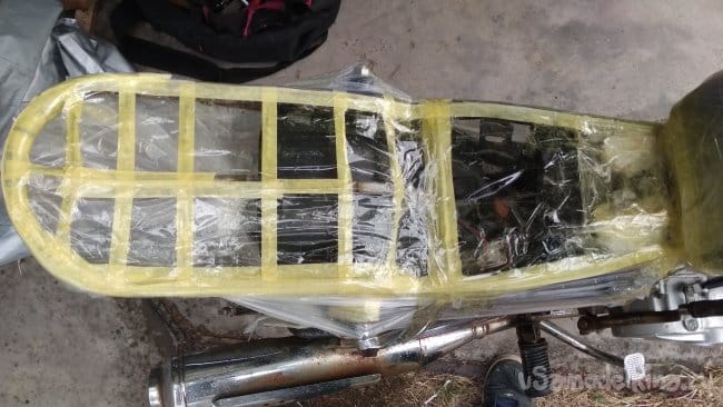 Жёсткий каркас седла, который ложится на раму мотоцикла, я пробовал делать из пластмассы низкого давления (канистры для воды из такой), но так как промышленного фена у меня в хозяйстве нет, то разогревал этот пластик, газовой горелкой. Уже сильно позже, когда потратил кучу времени и сил, мне объяснили что открытый огонь для такого материала противопоказан. Говорят что в принципе, из этого пластика хороший каркас сделать можно. Не могу согласиться с этим утверждением, как не могу и опровергнуть. В общем после всех экспериментов, пришлось мне заказать старую добрую эпоксидку и стеклоткань. Как бы не хотелось избежать этого грязного, долгого и токсичного метода, но всё же отвертеться не удалось.