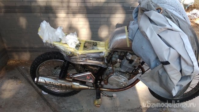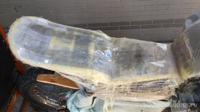 Раму и часть бензобака обклеил молярным скотчем и обтянул полиэтиленом. Здесь я не учёл тот факт что излишки смолы будут капать вниз с покатой поверхности. В результате глушитель и подножки изрядно заляпал смолой. Хорошо что всё это планировалось под замену, но всё же стоит быть поаккуратней.
