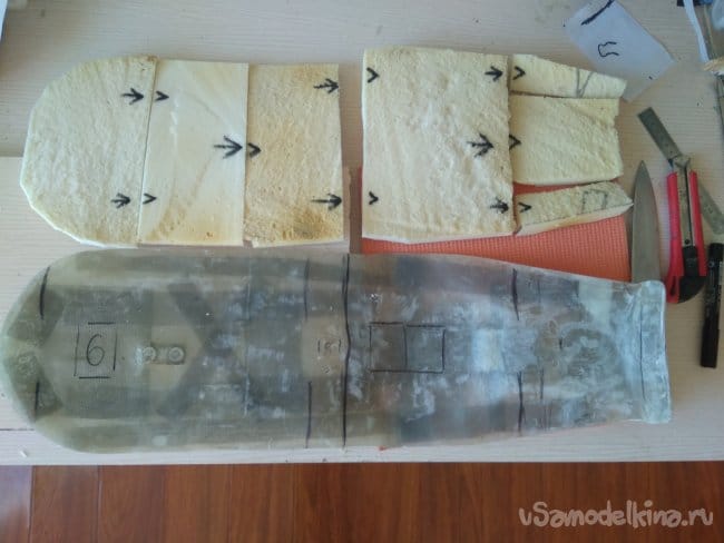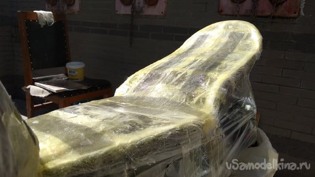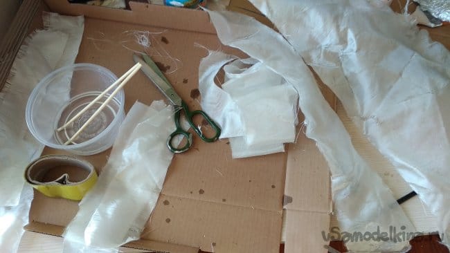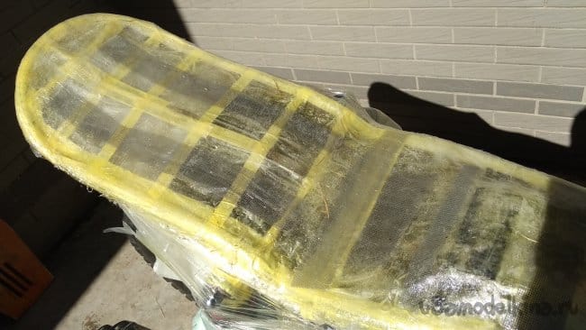 Далее, начинаем укладывать слоями заранее нарезанные полоски стеклоткани, тщательно пропитанные смолой. Этот метод описан во множестве источников, в том числе и УСамоделкина, поэтому расскажу только в общих чертах.