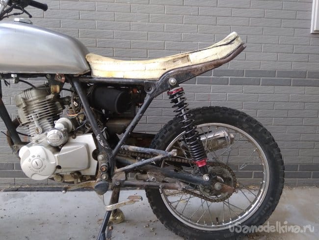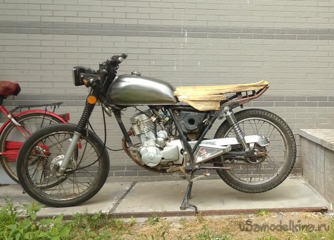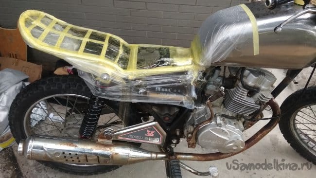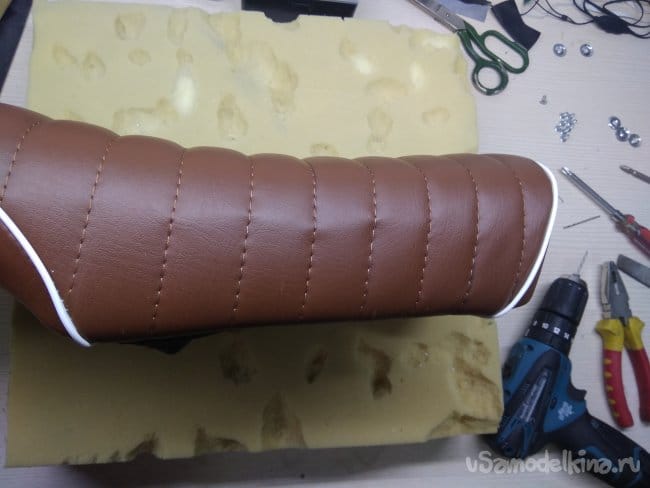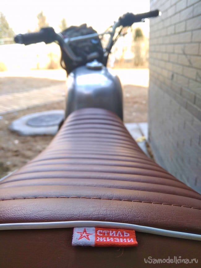 Так как у меня нет швейной машинки, то обшивку седла я просто заказал в интернете. Выбирал по цвету и стилю. А потом уже под крой, подогнал все остальные параметры будущего сиденья. Конечно, лучше было бы сшить обшивку под мотоцикл, а не строить мотоцикл под обшивку. Но возможности шить небыло, а вариант заказать в ателье, где профессионалы выполнят любой каприз за ваши деньги, оказался чересчур затратным. В итоге купил готовую обшиву и для красоты добавил ярлык от футболки. Мне кажется, что именно такие мелочи делают кастом интересным. Собственно вокруг этого ярлычка, в последствии был разработан весь дизайн мотоцикла, но это уже совсем другая история.