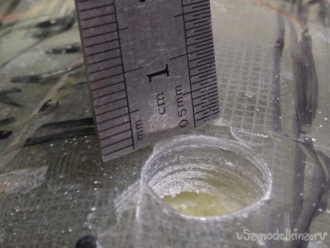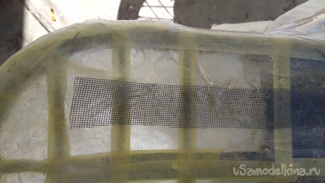 В тех местах где будет повышенная нагрузка делал слой потолще. Так же для армирования использовал москитную сетку от окон, она сплетена из волокон стеклоткани облитых резиной. Спорный конечно момент, но мне показалось, что так вся конструкция будет надёжней. Эту сетку укладывал небольшими фрагментами между слоями стеклоткани, как бы создавая рёбра жёсткости. Для удобства укладки стеклоткани, после высыхания каждого слоя, можно пройти его крупной наждачкой. Потому что если где-то что-то торчит, то при укладке следующего слоя может образоваться нежелательный пузырь.