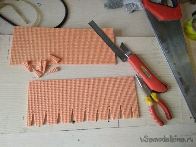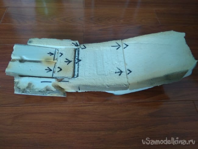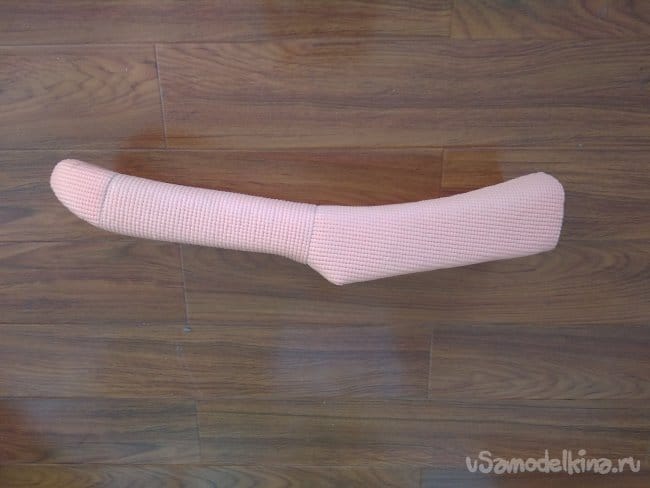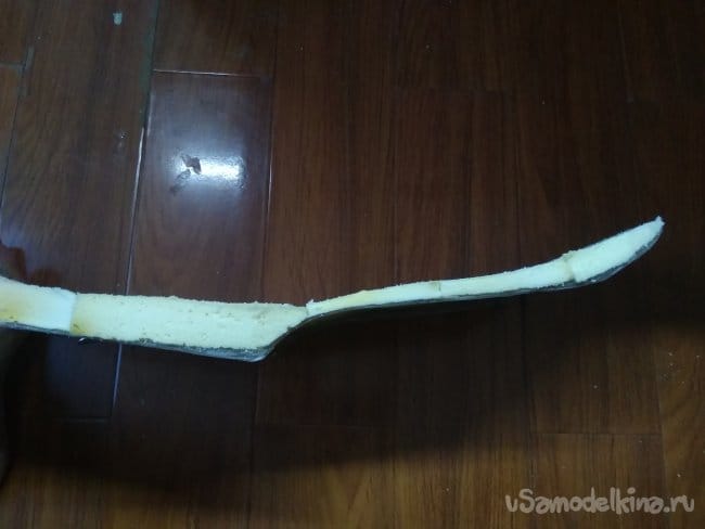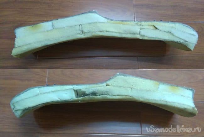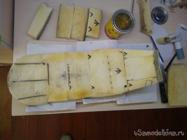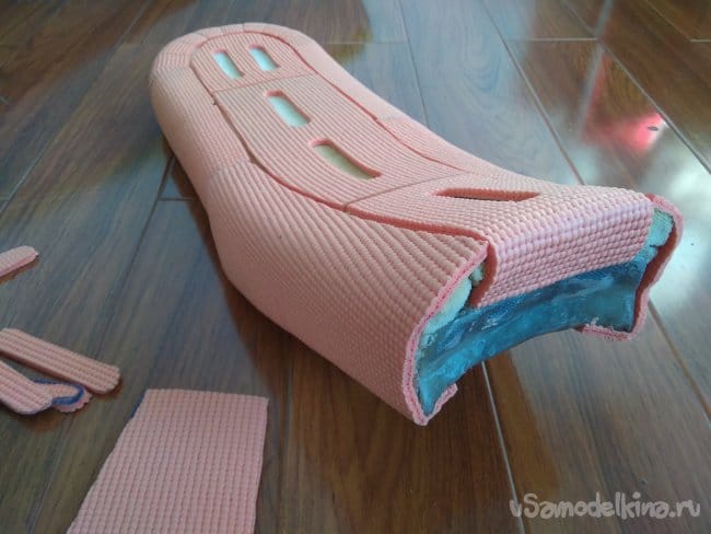 Подрезать излишки поролона, лучше после того как очередной слой приклеен и просушен. Дело в том что когда примеряешь сухой поролон к каркасу он ложится немного иначе чем уже промазанный клеем. Поэтому есть риск, что заранее обрезанные детали, где-то просто не совпадут.