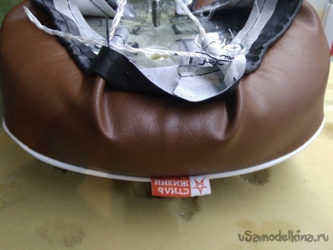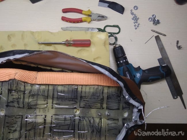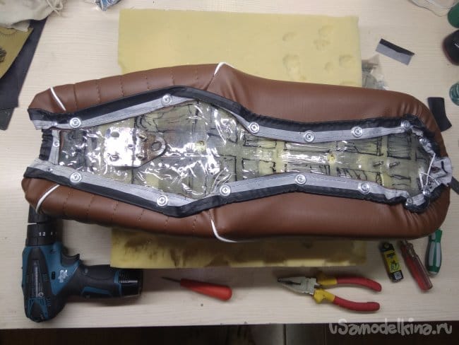 Далее всё просто — натягиваем обшивку, сверлим отверстия и вкручиваем саморезы с шайбами. Единственная сложность заключалась в том что в задней части образовывалась большая складка, с которой пришлось долго возиться. Вроде бы это и не страшно, всего одна сладка, но и вид она портила изрядно, её долго не получалось спрятать с глаз долой. Решение придумал следующее — вместо одной крупной складки сделал много мелких, но не выступающих на видимую поверхность. В идеале, стоит сделать треугольные выточки на обшивке и прострочить на швейной машинке.