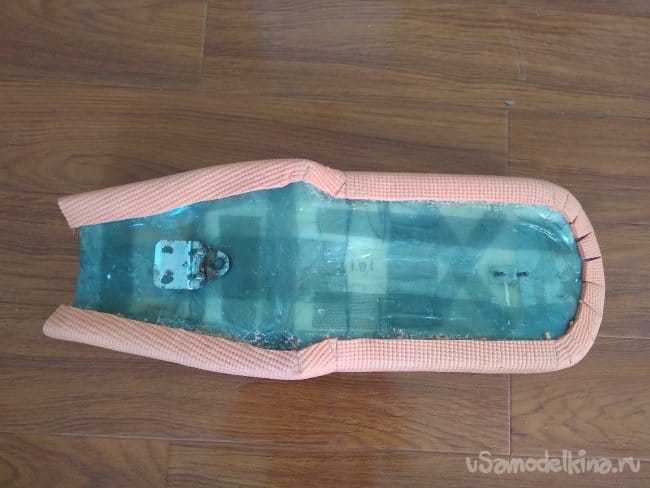 Далее я решил обклеить торцы сиденья по периметру гимнастическим ковриком. Во первых для того чтобы обшивка не тёрлась о края каркаса из стеклоткани, а соприкасалась с мягким ковриком. Это важно, потому что седло по всему периметру ляжет прямо на раму. А во вторых, структура поролоновых слоёв не будет проступать через тонкую дерматиновую обшивку.