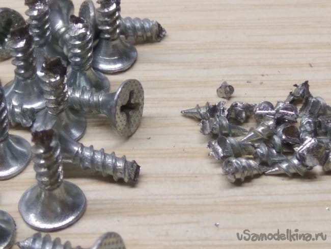 Долго думал как крепить шкурку молодого дермантина на каркас. Мебельный степлер сразу отпадал — с композитом он не справится. Разные клеи тоже не вариант — не надёжно. Остановился на саморезах и больших шайбах. Но тут же столкнулся с нелепой проблемой - полным отсутствием коротких саморезов. Обошёл все магазины - НЕТУ. Городок у нас меленький и можно только в интернете заказать, но это уже слишком. Решил обрезать имеющиеся саморезы до нужной мне длинны.