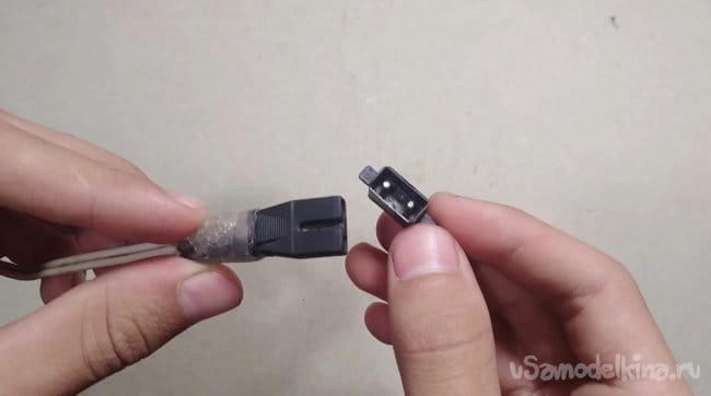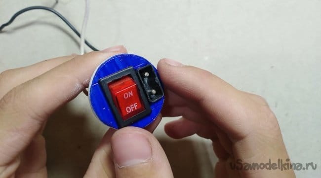 Вот что получилось. Я вырезал отверстия и окрасил все синим маркером. После чего все вставил и вклеил с помощью горячего клея и потом спаял разъем и выключатель и вывел провода для электродвигателя.