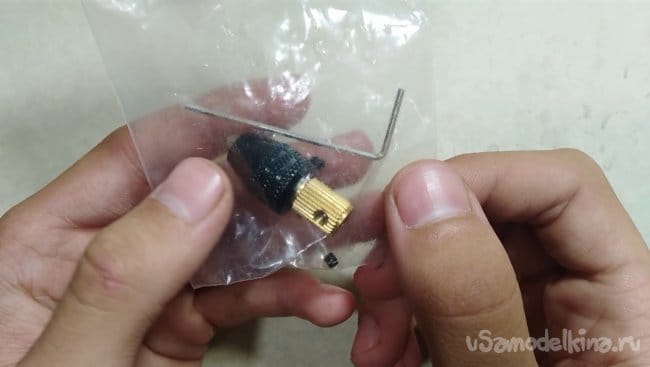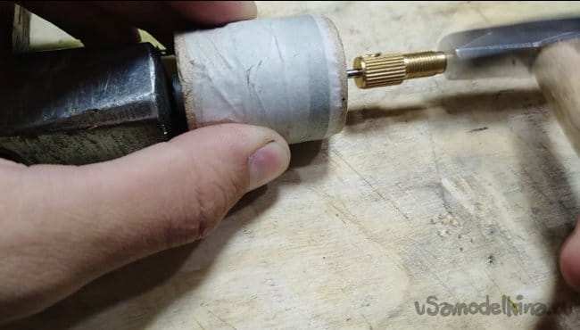 Теперь только нужно вбить переходник для патрончика, так-как переходник входить достаточно туго и его нужно вбивать, то нам нужно упереть вал сзади, я прикладываю молоток и маленьким спереди забиваю, и потом уже закручиваю винты которые идут в комплекте. Все вставляю в середину и дополнительно прикрутил переднюю щеку из пластика просто для красоты.