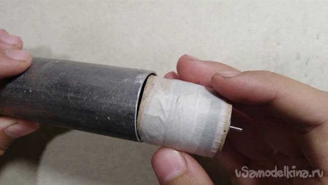 Вообщем я сделал муфту из картонки от трубки от фольги и металлической пластины которая есть на самом двигателе. Я сделал один слой картонки и сверху ту металлическую пластину и закрепил обычным малярно-бумажным скотчем. Ну а теперь все должно плотно влазить в трубу.