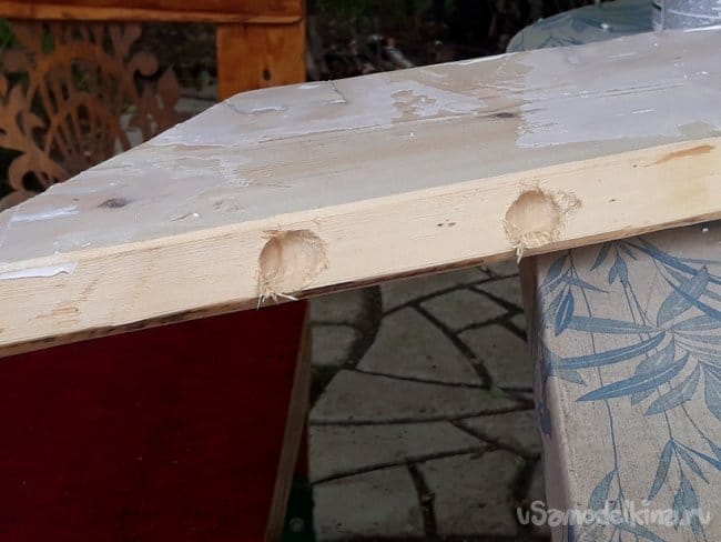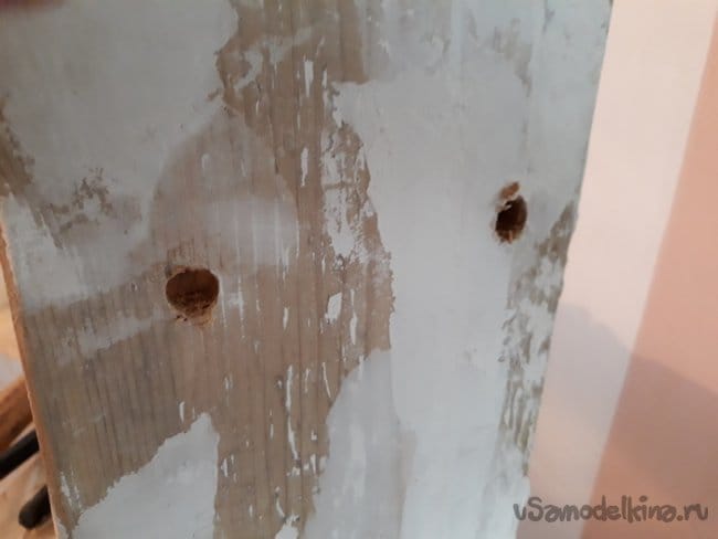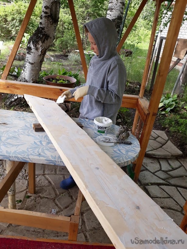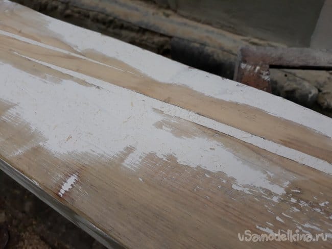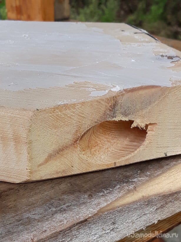 Затем повернул стороной с трещиной вверх. И заполнил трещину приготовленным тут же составом из клеевой шпаклевки, клея ПВА с добавлением опилок. Этим составом при помощи шпателя заполнил полости трещины.