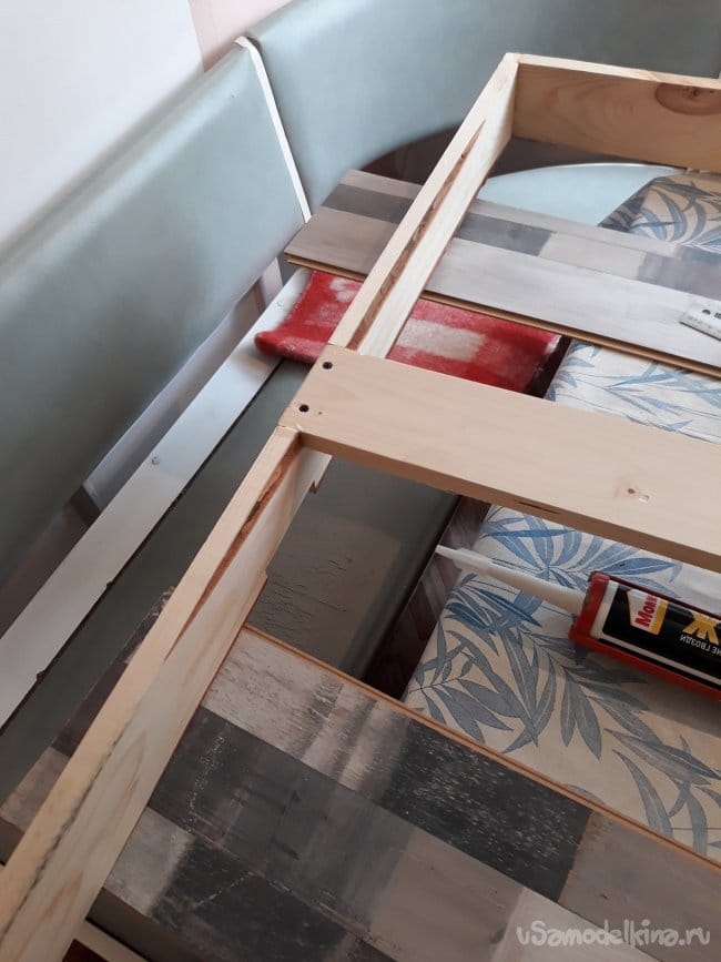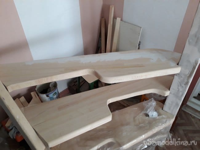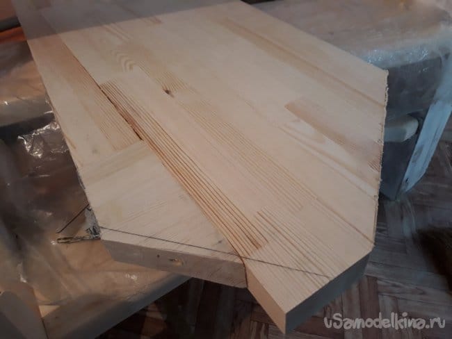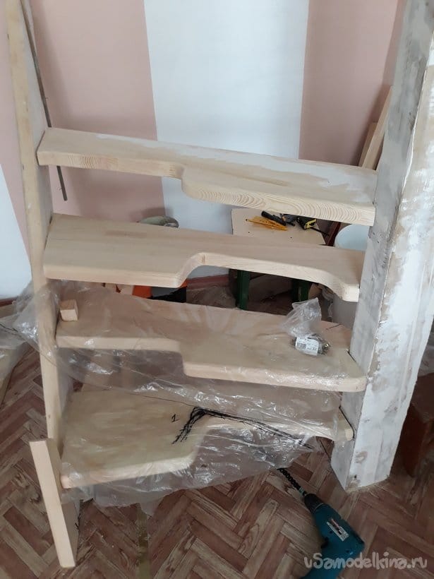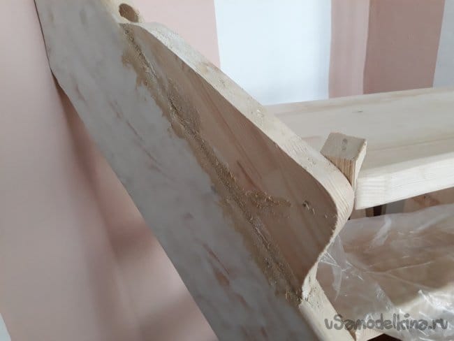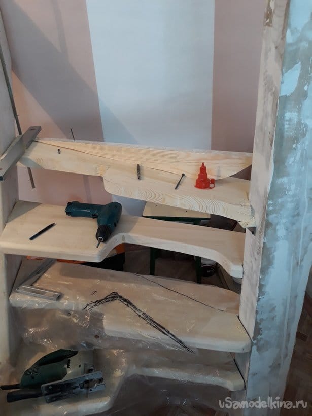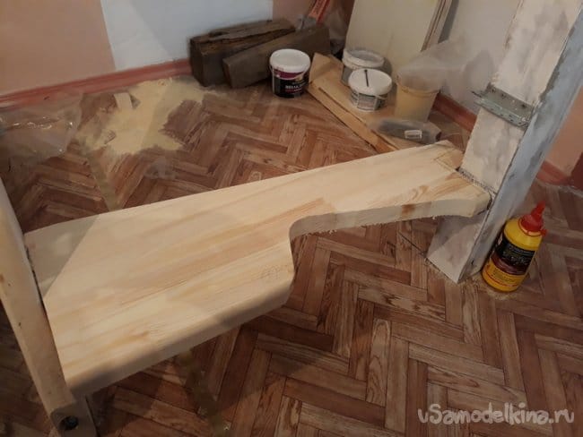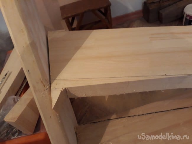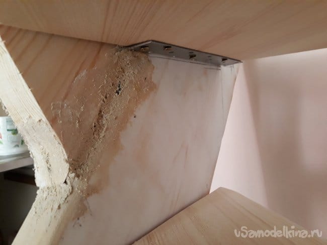 Обработав спилы шкуркой, установил на место и занялся четвертой ступенькой. Процесс повторился - разметил и установил уголки. Ширины (300 мм) покупной ступени мне не хватило. Но, имея прорисовки и макет, был готов к этому. Используя обрезки от предыдущих ступеней, клей ПВА и длинные саморезы, я добавил ширину четвертой ступени.