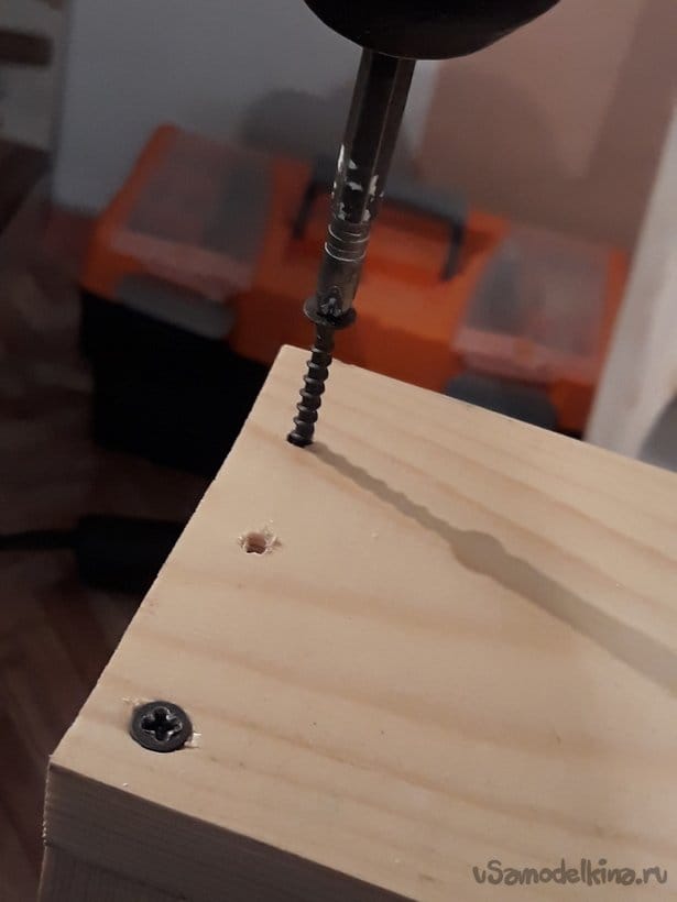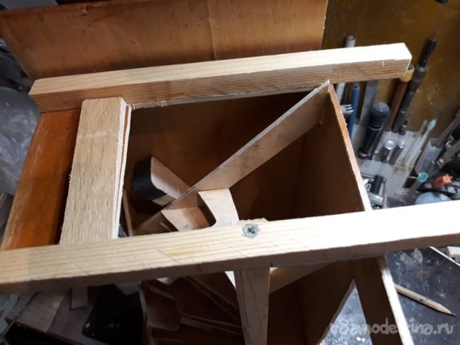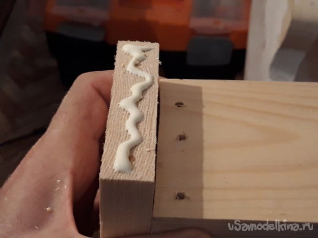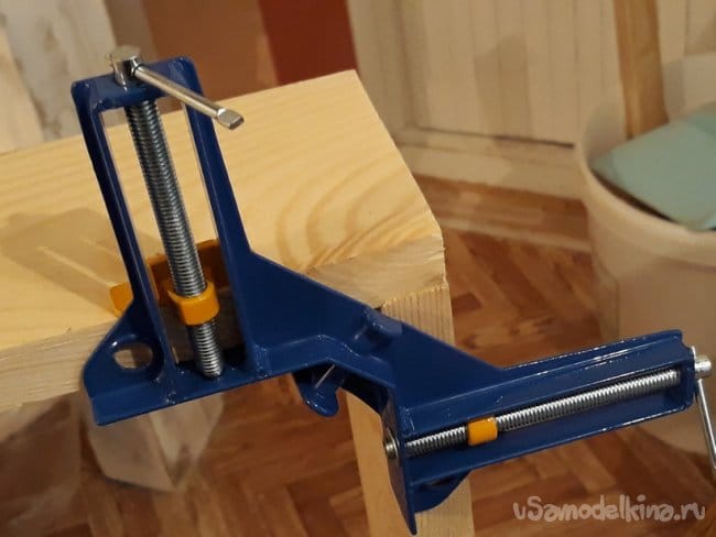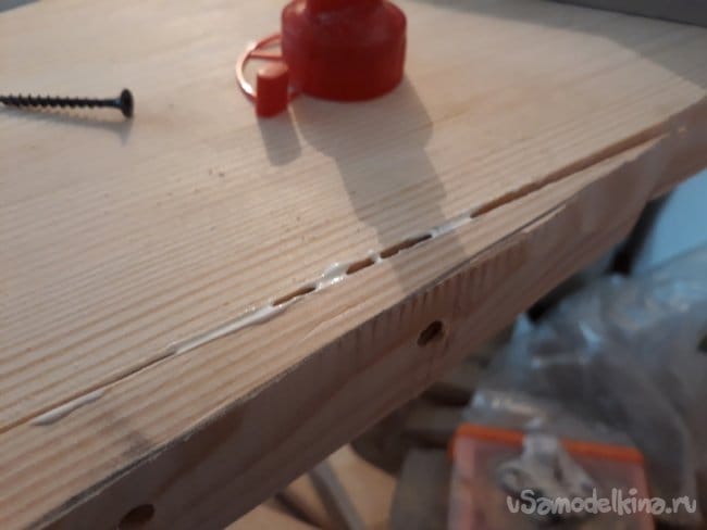 Потом занялся изготовлением непосредственно крышки люка. Её сделал из доски шириной 90 мм, для того, что бы можно было уложить утеплитель. Детали соединил на клей ПВА. Стянул струбциной, затем протянул саморезами.