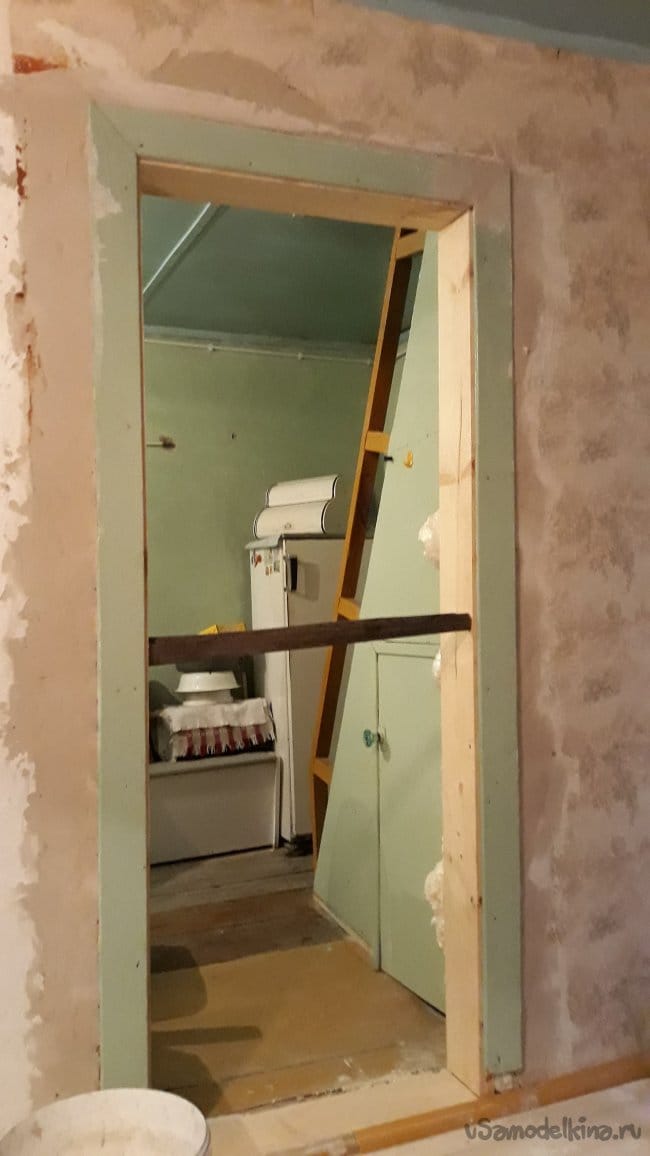 Отвратительно было то, что она должна была вписаться в люк с размерами 800 мм по ширине и 1100 мм по длине. Больше чем на 200 мм я не мог увеличить размер люка. Размеры старого люка были - 800 мм по ширине и 900 мм по длине. Если по ширине меня все устраивало, то по длине нет. Но, при увеличении длинны люка более 200 мм, мне пришлось бы переделывать водопровод. Выход его через потолок на кухню, хорошо видно на приведенном выше фото. Конечно, на так сложно – взял и перенес. Но, верху труба подходила в плотную к будущей вертикальной стене верхнего помещения. По этому ее переносить было проблематично. Хорошо, хоть высота от пола до пола (на втором этаже) составляла 2400 мм. Получается высота ступени 200 мм (рекомендуемая для жилых помещений 190 мм), не совсем комфортно, но терпимо. Поскольку если уменьшить до 160 комфортных мм, количество ступеней увеличится до 15 штук. А, в деньгах это примерно увеличение стоимости материала до 2000 рублей. А, надо экономить.