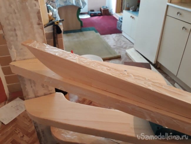 А, сам занялся строганием второй тетивы. Технологический процесс то же самый. Только в одном месте пришлось сделать вставку. Потом, тоже отдал помощнику на подготовку поверхности.