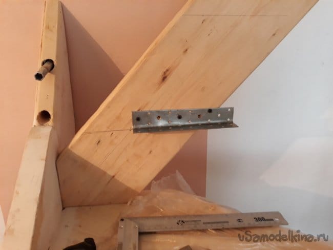 Сделал разметку по установке первой ступени. По разметке установил уголки, согнутые из пластин.