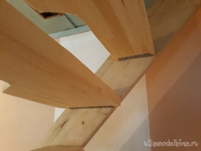 Уже установленные ступени протянул прямо через металлические уголки крепления, предварительно просверлив подходящим сверлом. Через тетиву пошли короткие нагели.