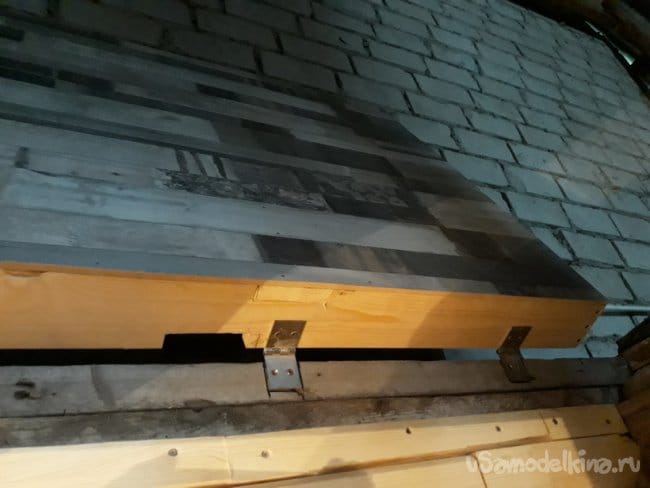 Готовую крышку люка установил на место. По периметру прилегания проложил клеевой плоский утеплитель для устранения возможных щелей, между крышкой люка и проемом.