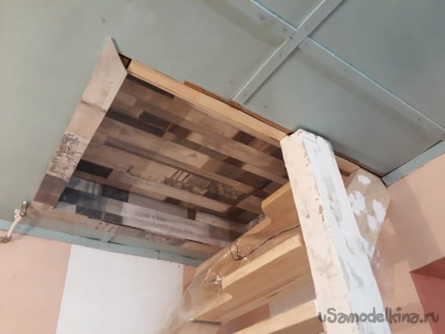 Со стороны лестницы люк закрыл обрезками ламината, имеющегося в наличии.