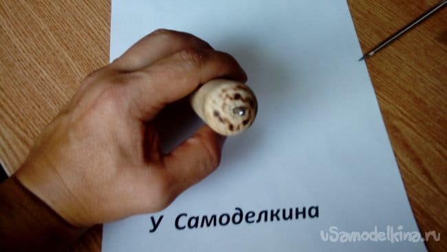 Берем кусок черенка (в моем случае черенок от грабель диаметром 25 мм и длинной 11 см) и с помощью наждачной бумаги закругляем его концы. Затем вбиваем гвозди (в моем случае гвозди 70 мм так, как их диаметр совпадает с диаметром пасты от ручки которую я буду использовать в центре кормушки) в центр каждой из сторон, оставляем длину сантиметра полтора и отпиливаем лишнее. Должно получится примерно так…
