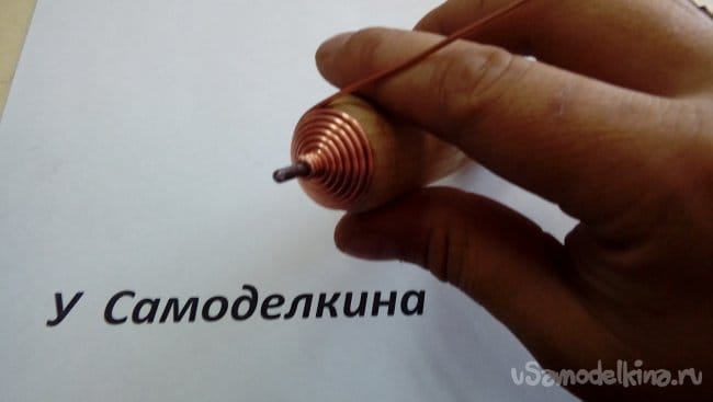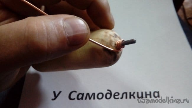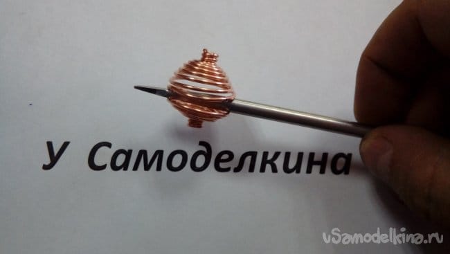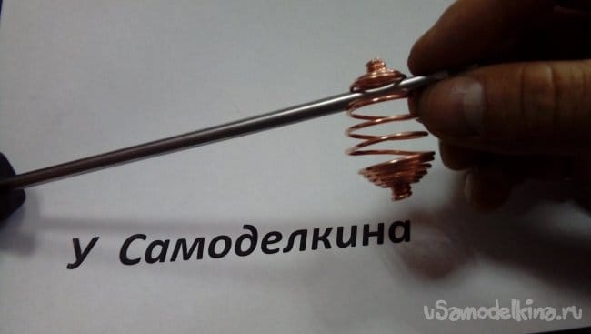 Затем сдвигаем проволоку вплотную к черенку и удерживая ее плоскогубцами продолжаем накручивать спираль до середины проволоки. Должно получиться так…