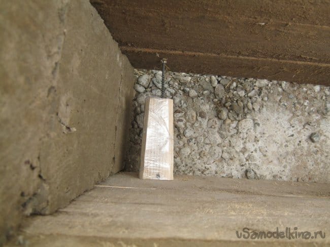 Уровень верхнего края отливки – закрепленный шнур. Закрепляется изнутри коробки-опалубки и выверяется по строительному пузырьковому инструменту длиной 1 м.