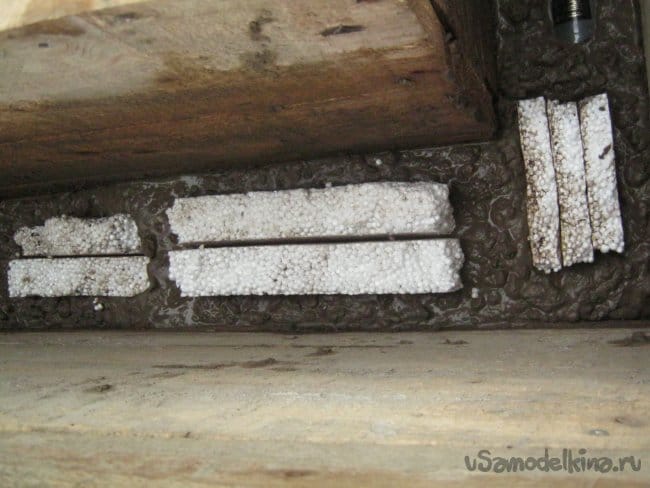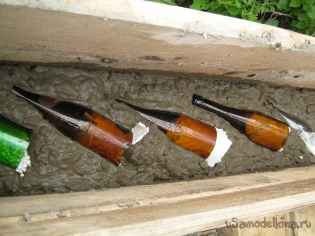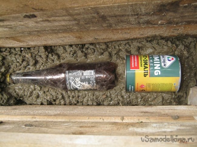 Важным моментом является организация пустот в отливке, на первом месте по удобству и практичности – листовой пенопласт и стеклянные бутылки. На фото – горлышки, оставшиеся от экспериментов с бутылочным резаком.
