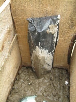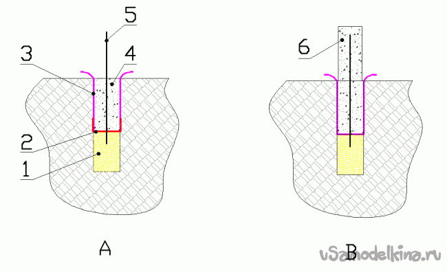 Гидроизоляция на стенках траншеи (поз.3 см эскиз) выполняется аналогично, края ее снаружи удобно пришпилить к грунту крупными гвоздями. Следует сказать, что силы морозного пучения в особенно неблагоприятном случае могут зажать подземную бетонную часть с боков и стремиться вытолкнуть ее. Для сильного уменьшения эффекта, достаточно гидроизоляцию стенок выполнить из рубероида.