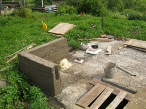 Следует сказать, что густое армирование сильно затрудняет закладывание таких элементов, но оно, особенно «густое» применяется в сельской практике не часто. Здесь, запечатлен отлив бортика-фундамента на бетонной крышке-плите погреба, армирование при этом не выполнялось вовсе. Закладывание пустотообразующих элементов может быть использовано при многих массивных бетонных работах – печные фундаменты, стяжки и подобные конструкции.