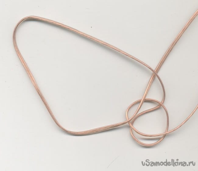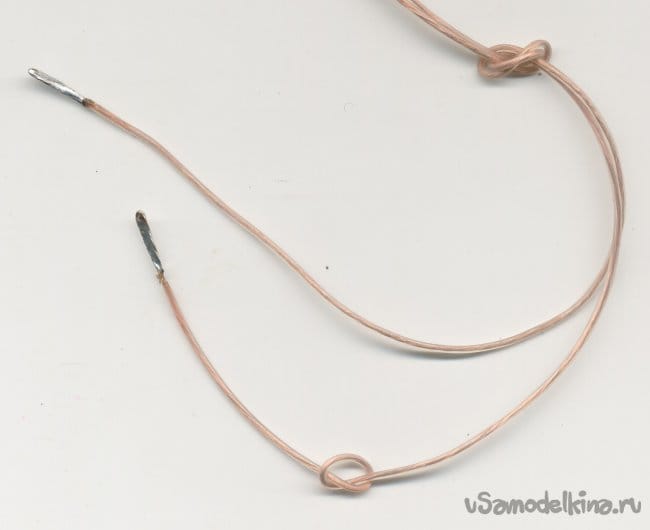 Плюс, как водится, промаркировал узелком. Концы свернул петелькой и облудил (от моего лабораторного блока питания выведен шнур с «крокодилами» на концах).