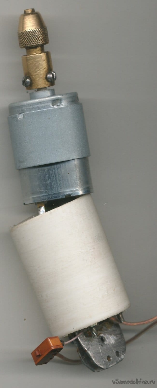 На выступающую часть корпуса моторчика (где ось якоря), надел отрезок резиновой трубки. Это для того, чтобы при сборке и эксплуатации корпус при нажиме не сместился и не повредил контакты мотора.