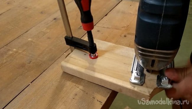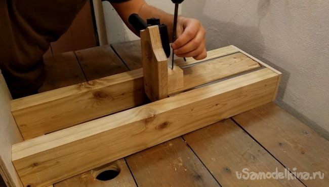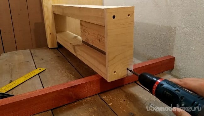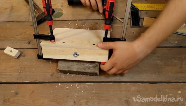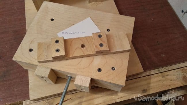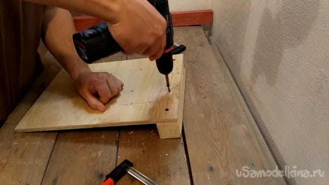 К фанерному основанию приложить поперечину, закрепить струбцинами. В намеченных местах просверлить отверстия и закрепить саморезами по дереву. Получилось основание.