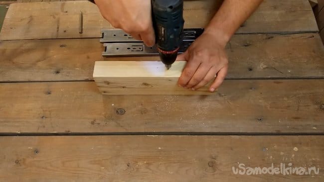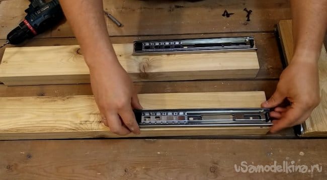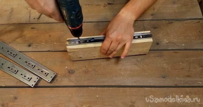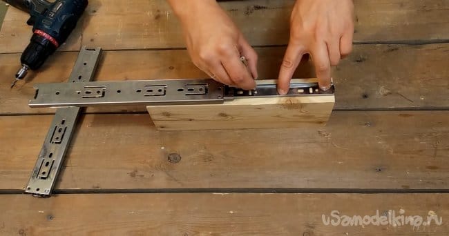 Примерить направляющие, проверить, соединить детали саморезами. Повторить для другой стороны. После того, как мы разъединили части направляющих необходимо их дополнительно закрепить третьим саморезом.