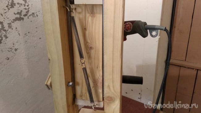 На задней стороне конструкции просверлить отверстия для крючков для пружин, собрать.