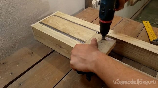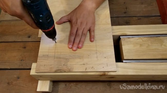Направляющую приложить к бруску 45х90х300 мм, разметить карандашом места сверления отверстий. Перевернуть отрезок на 180 градусов, повторить. Просверлить по два отверстия с каждой стороны.
