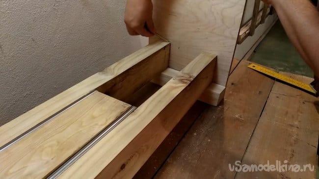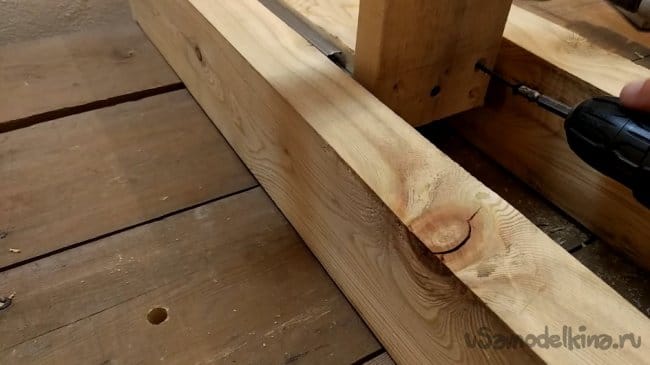 Примерить нижнюю поперечину из бруса 50х50 мм (она нужна для увеличения жесткости конструкции), приложить фанерное основание, обвести карандашом места соединения с торцами стоек.