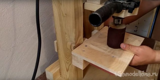Если остались обрезки бруса и наждачная бумага, можно изготовить приспособление для шлифовки (самодельный шлифовальный барабан).