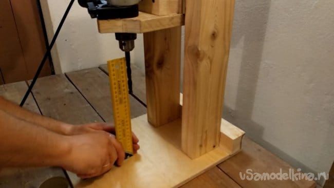 При необходимости воспользоваться струбциной. Проверить вертикальную ось стойки для дрели.