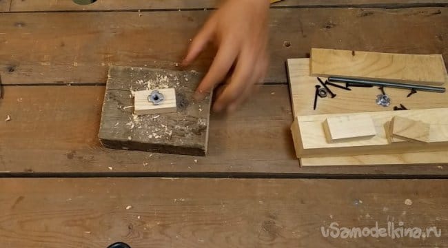 Барашковую гайку изготовить из кусочка рейки - начертить диагонали, найти центр, просверлить. Установить врезную гайку М8, загнать внутрь ударами молотка.