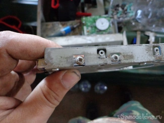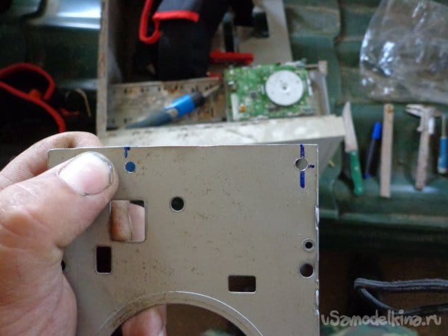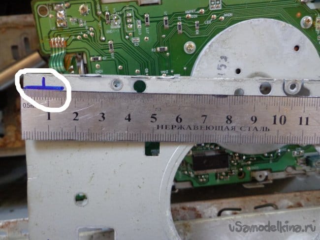 Далее замеряем расстояние между отверстиями на самом диске и отталкиваясь от меток переносим их на нижнюю часть платформы, а поскольку одно отверстие уже имелось и второе оказалось большим, из-за того что там находился моторчик от флупика, то оставалось сделать только две дырки сверлом подле самих контактов.