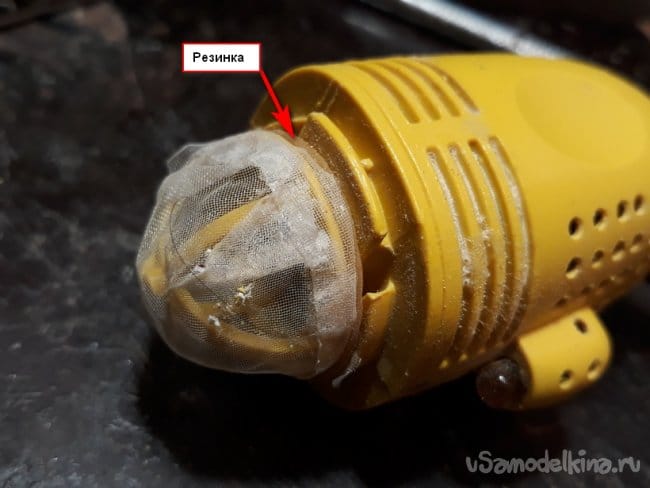 Крепление оставил тоже – резинка. Применение чайной сетки обусловлено тем, что она очень мелкая и крупные отходы на ней не держатся, падают в контейнер для мусора. Пыль, если и проходит, то с потоком воздуха будет выводится вниз пылесоса, не попадая в лицо.