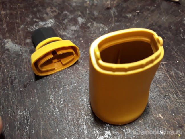 Переходим к последнему пункту модернизации. Это контейнер для сбора отходов. Его не замысловатое устройство и позволяло, после выключения пылесоса вываливаться обратно на стол. Отходам просто не где было задерживаться.