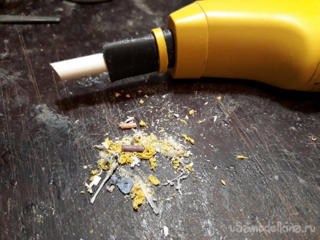Когда работаешь над моделью корабля используешь различный материал. И дерево, и фанеру, и кусочки оргстекла, да и металлическая стружка тоже бывает. Но, вот убирать отходы несколько проблематично. Всегда остаются мелкие фракции, которые трудно удалить. Подумал, что хорошо бы иметь маленький пылесос под рукой для этой цели. И тут-то я и вспомнил про этот забытый девайс. Решил применить его.