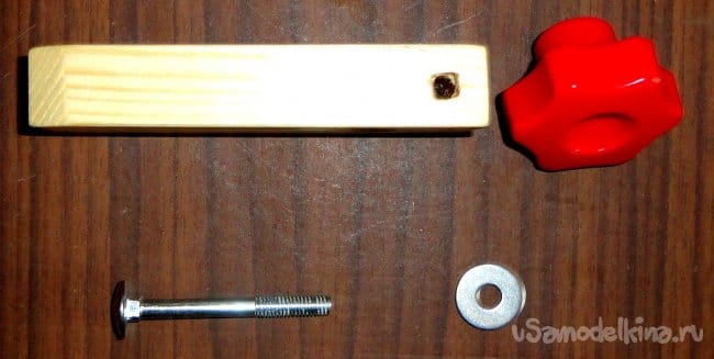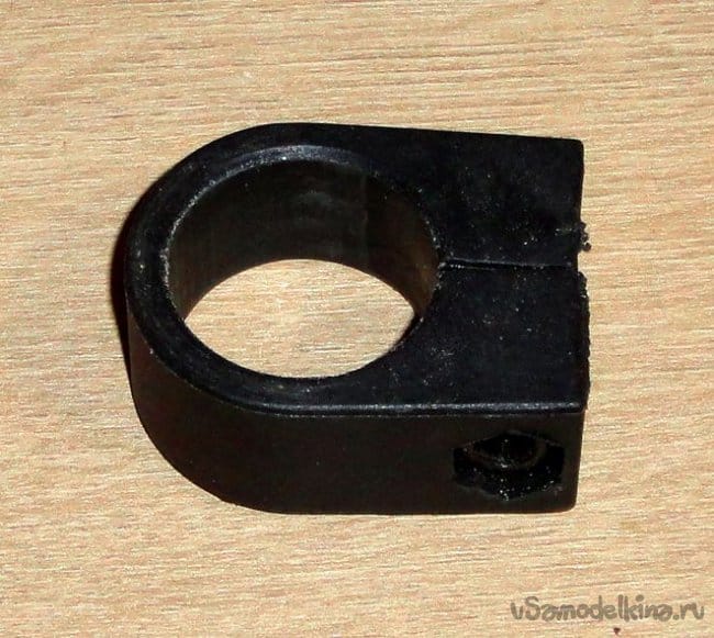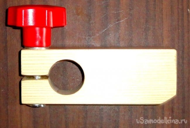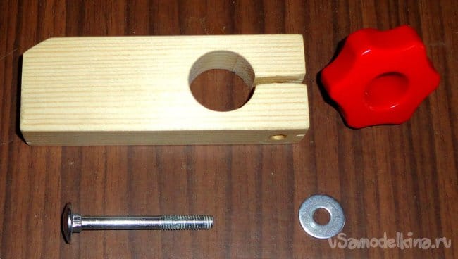 При его изготовлении был использован деревянный брусок размерами 20х40х110мм. Отверстие высверлено перьевым сверлом 25мм. Пропил шириной около 3мм. В качестве стягивающих элементов были использованы: мебельный болт 6х55мм., пластиковая «вертушка» с металлической гайкой внутри и кровельная шайба.