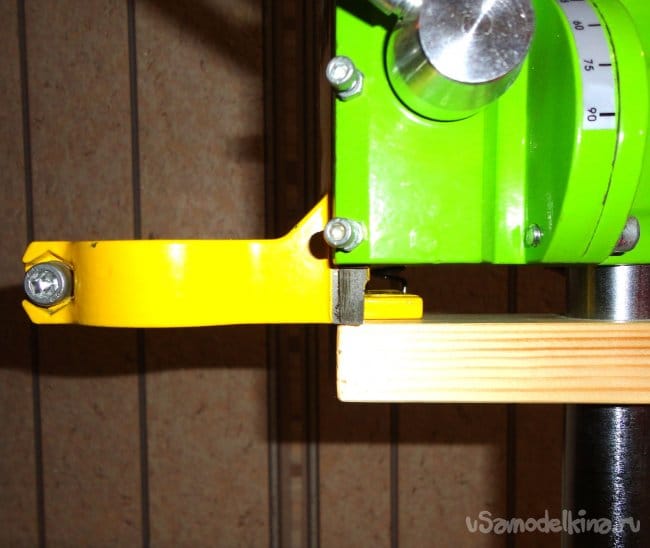 Данный ограничитель был заменён на самодельный, который и выполняет функцию основного ограничителя глубины сверления в качестве регулируемого упора для подвижной каретки.