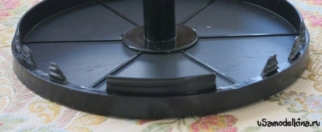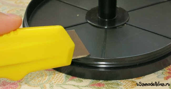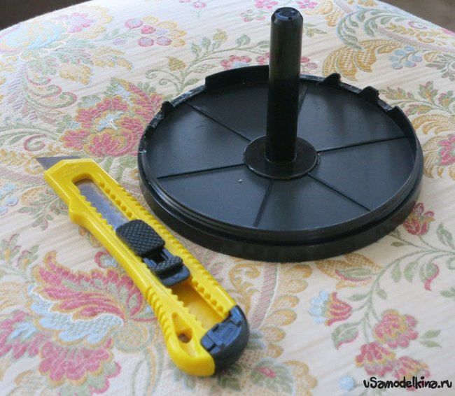 Мне не хотелось выходить в тот день из дома, идти в магазин за какими-то материалами, поэтому я решил соорудить подставку из подручных средств. Я уверен, что у многих дома валяется кейк-бокс для CD-дисков – такой круглый пластиковый контейнер с крышкой и штырем посередине, куда нанизываются диски.