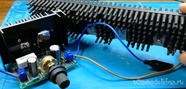 С таким радиатором схема может долго работать только на небольших токах. Для того, чтобы схема работала долго на полную мощность нужен более массивный радиатор.