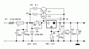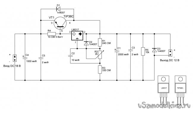 Конденсатор C2 (керамический 1-10 мкФ) – припаивается параллельно переменному резистору и улучшает стабильность регулировки.Чтобы при разряде конденсатора C2 защитить микросхему LM317 ставится диод D2. Они вместе с диодом D1 защищают микросхему и транзистор от обратного тока. Диод D3 служит для защиты схемы от ЭДС самоиндукции при питании электродвигателей. Конденсаторы C4 (электролитический 35В 470-1000 мкФ) и C5 (керамический 1-10 мкФ) образуют входной фильтр, а конденсаторы C1 (электролитический 35В 1000-3300 мкФ) и C3 (керамический 1-10 мкФ) образуют выходной фильтр. Резистор R5 на 10к Ом (мощность любая) создает небольшую нагрузку для стабильности работы схемы на холостом ходу и помогает быстрее разрядить конденсаторы в случае отключения питания схемы.
