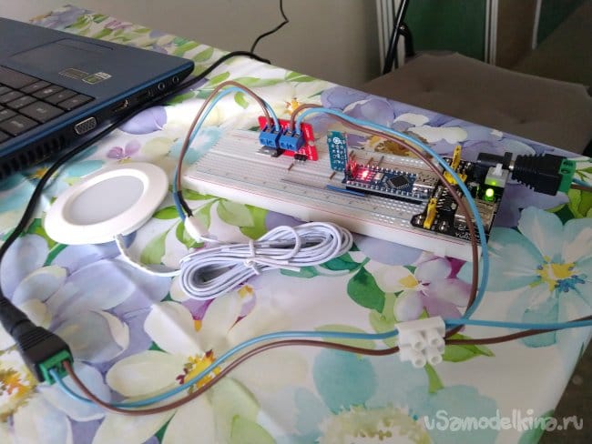 Сначала на макетной плате был собран прототип, использующий готовый модуль кнопки. Вместо помпы для тестов использовался потолочный светильник на 12 В.