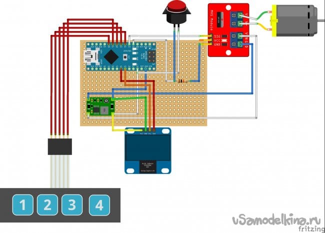 - Мембранная клавиатура 1x4 была выбрана по единственной причине: для нее написана удобная библиотека AmperkaKB, которая позволяет просто пользоваться этой клавиатурой, а не думать о срабатываниях, событиях, залипаниях и дребезжаниях. Да, я знаю, что в этой библиотеке код сразу для трех клавиатур – памяти Arduino Nano хватает. Порядок контактов этой клавиатуры не соответствует порядку кнопок: первый контакт общий, у остальных контактов порядок, обратный нумерации на клавиатуре;