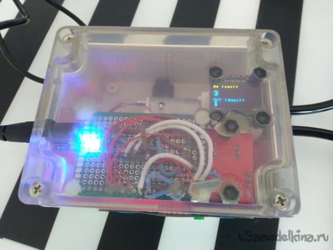 Устройство работает очень просто: по нажатию на зеленую кнопку полив осуществляется форсированно. Если нажать на нее во время полива, он прекращается. В автоматическом режиме полив осуществляется через интервал, кратный суткам. Длительность полива (в секундах) и паузы (в сутках) регулируется с помощью мембранной клавиатуры (надо где-то найти наклейки «больше-меньше»).