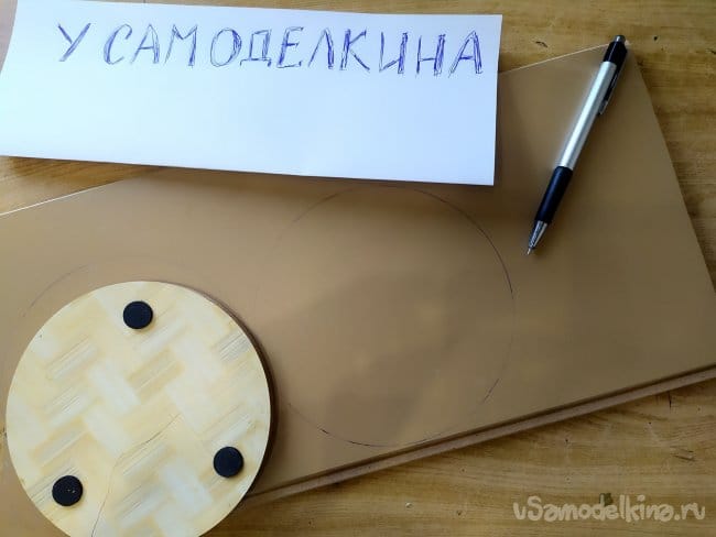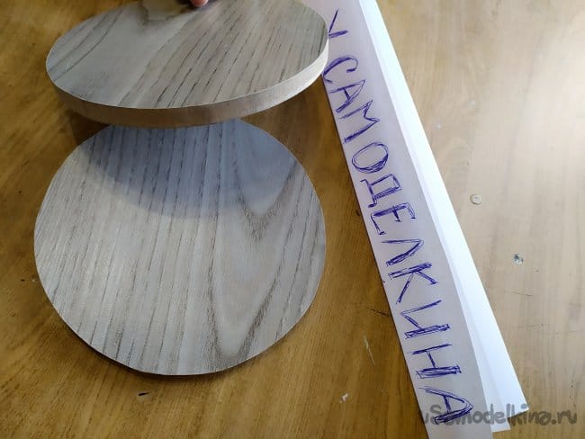 Если у вас нет ничего примечательного под рукой, то формой послужат тарелки. Выберите подходящий размер, и, ручкой, либо карандашом начертите на обратной стороне ламината круги, в нужном количестве. Я в итоге сделала их четыре, но так как часто бывают гости, которые не прочь выпить чайку на кухне, то в будущем, планирую увеличить колличество.
